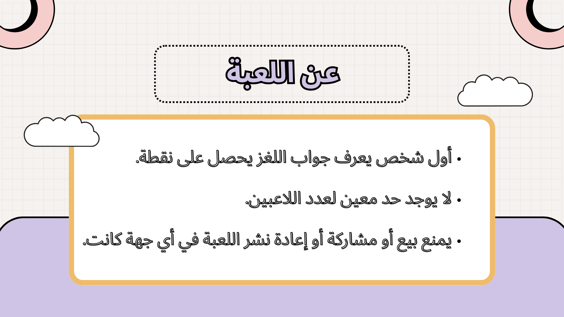 - عدد شرائح اللعبة: 61 (شريحة سؤال وشريحة جواب)