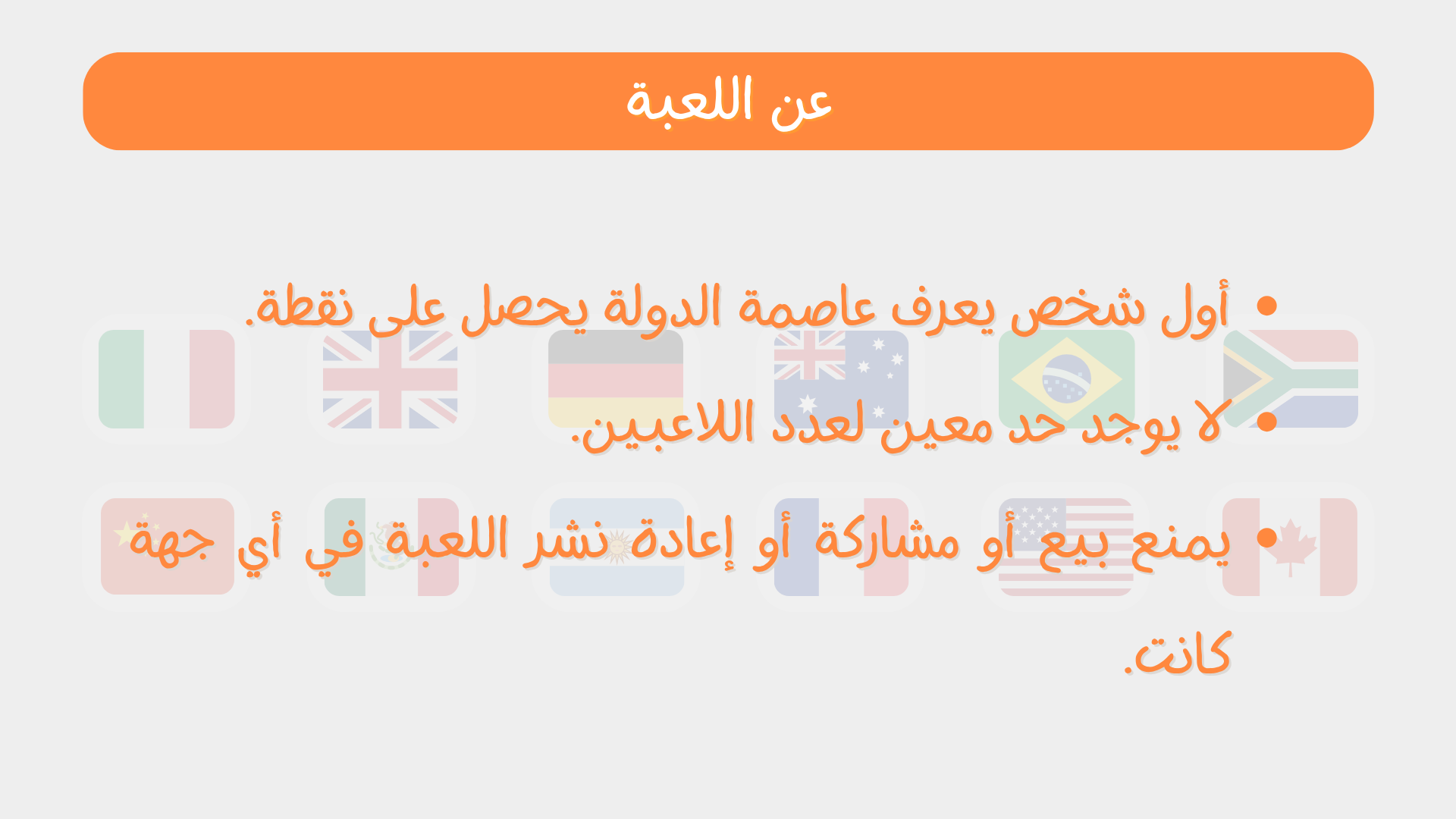 • أول شخص أو فريق يعرف العاصمة يحصل على نقطة.